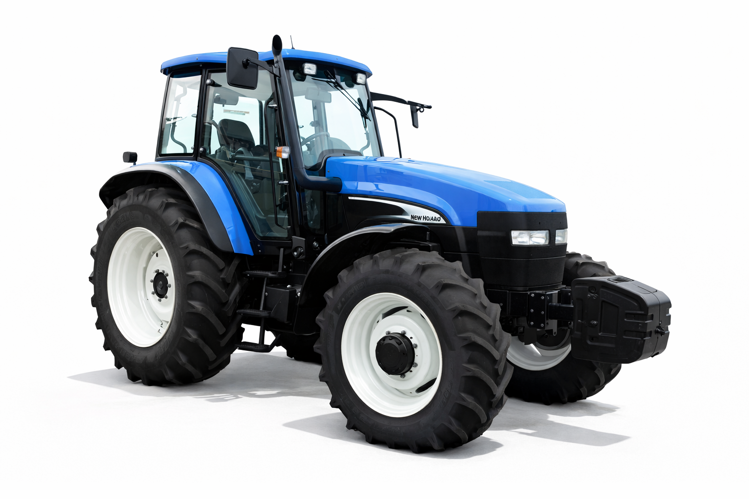 The New Holland TM140 features the classic New Holland blue body, white wheels, and enclosed cab, characteristic of the TM Series tractors used worldwide in modern farming.