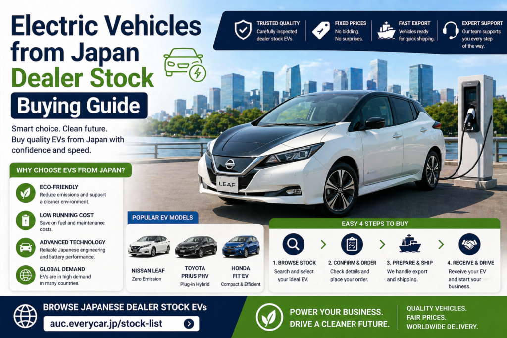 Electric Vehicles from Japan dealer stock guide helps buyers understand how to enter the EV market with confidence. Japanese EVs offer strong quality, advanced technology, and reliable performance.