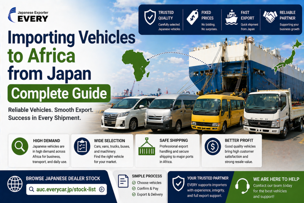 Importing Vehicles to Africa from Japan Guide is essential for dealers, importers, and business buyers who want reliable and cost-effective vehicles. Japan is one of the most trusted sources for used cars, trucks, buses, and machinery, especially in African markets.